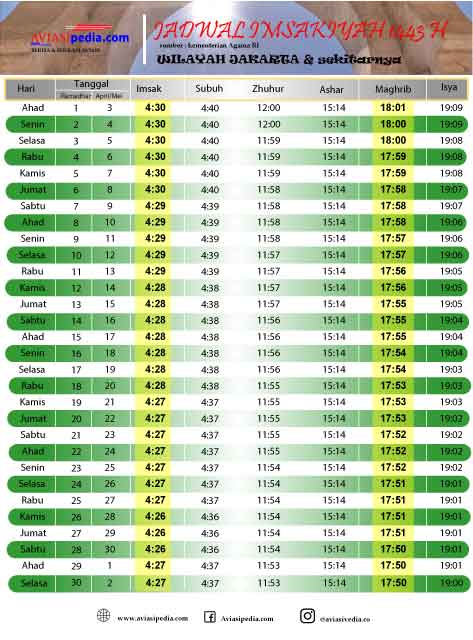 Untuk lebih sempurna mempersiapkan ibadah puasa bulan Ramadhan, ada baiknya kita mempunyai jadwal imsakiyah sebagai referensi kita untuk mengatur waktu kegiatan ibadah kita seperti sahur, buka puasa, shalat fardu, shalat sunah dan shalat tarawih.