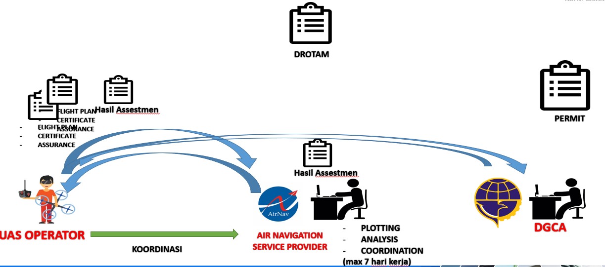 Ada beberapa proses perijinan Drone dari pengajuan sampai dengan pengoperasian. Secara singkat Mekanisme perijinan Drone meliputi Permohonan Safety Assestment, Permohonan Ijin Pengoperasian Pesawat Udara Tanpa Awak dan Permohonan Penerbitan Notam.